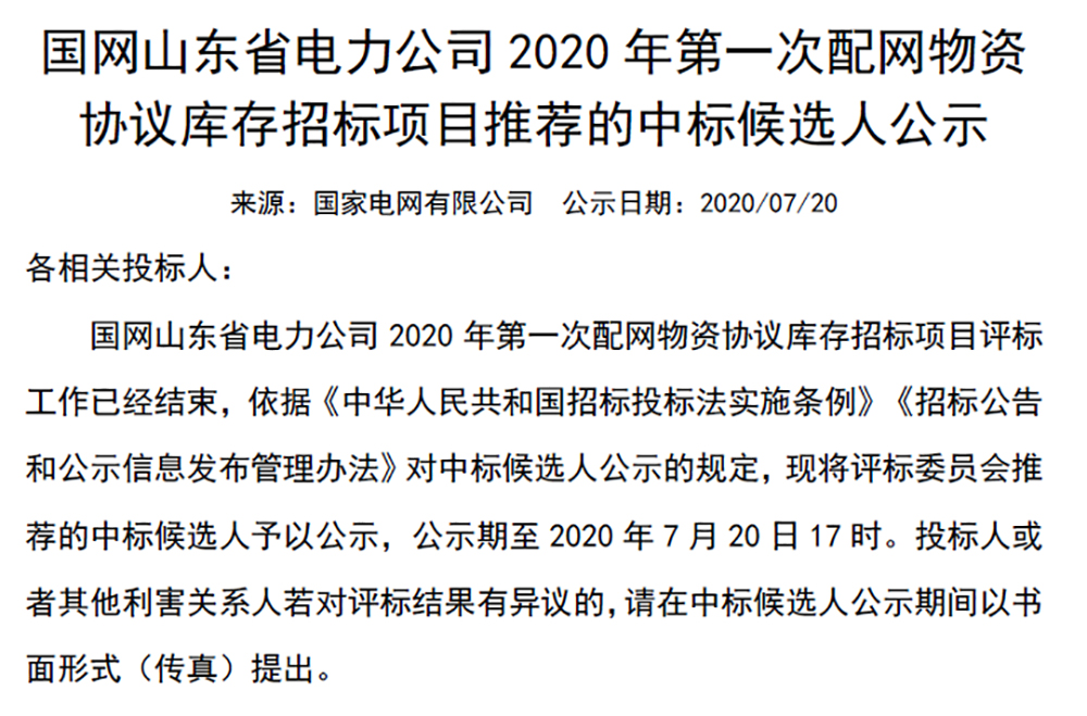 热烈祝贺我司中标国网山东省电力公司2020年第一次配网物资协议库存招标项目招标文件