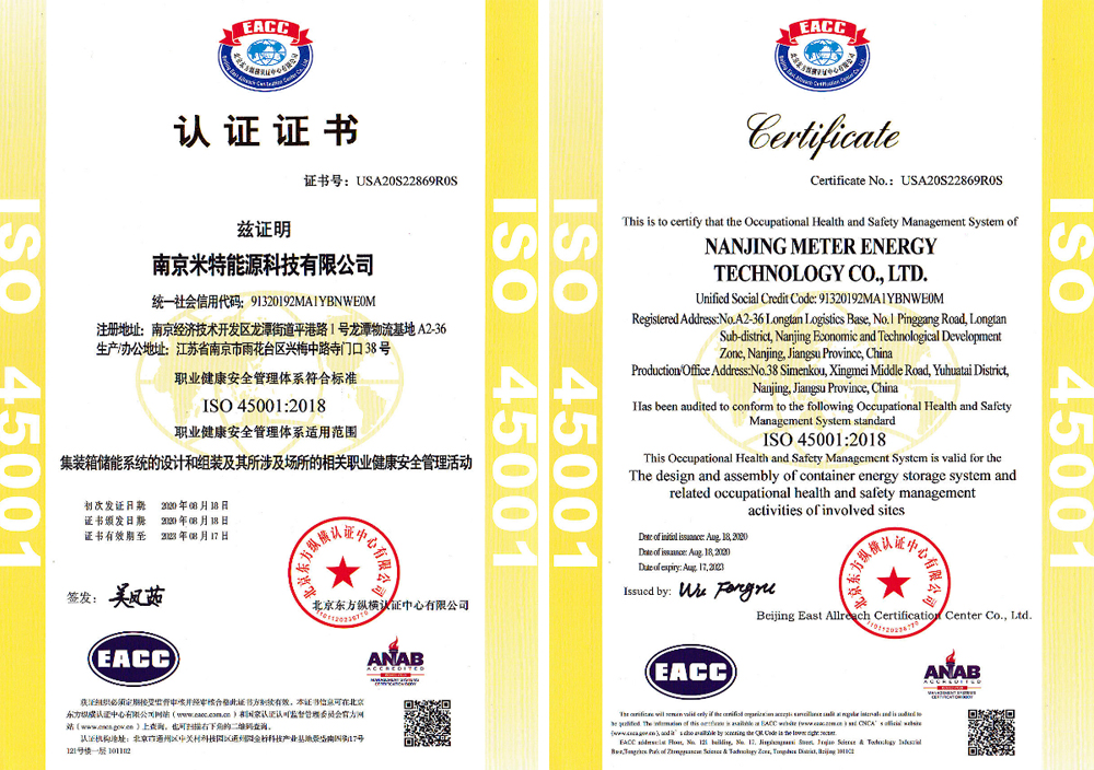 8月18日,米特科技全资子公司——南京米特能源科技有限公司获得ISO(国际标准化组织)三项管理体系认证:ISO9001质量管理体系认证,ISO14001环境管理体系认证,ISO45001职业健康安全管理体系认证,认证范围涵盖集装箱储能系统的设计和组装、集装箱储能系统的设计和组装及其所涉及场所的相关环境管理活动以及集装箱储能系统的设计和组装及其所涉及场所的相关职业健康安全管理活动等。